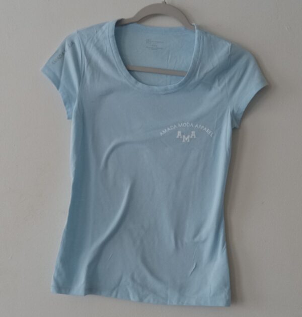 Be the first to review “Amada Moda Apparel Active Ladies Tee Baby Blue W/ White Logo”