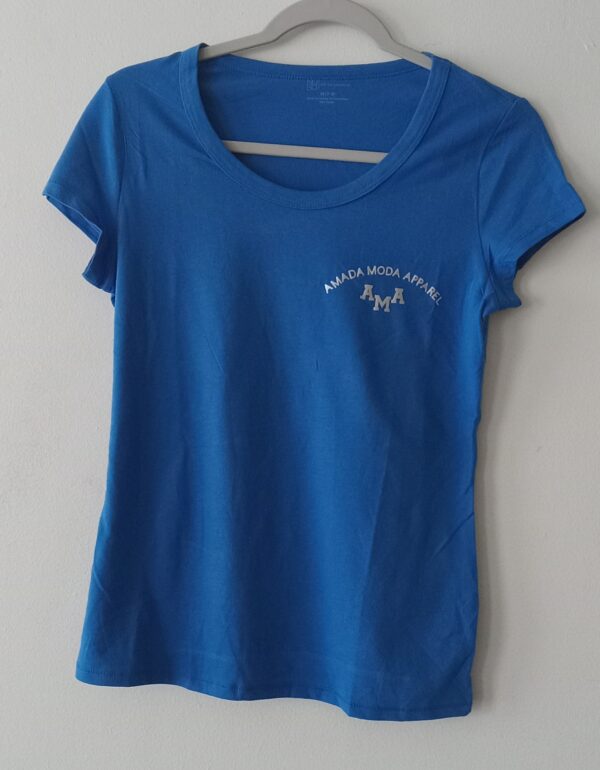 Be the first to review “Amada Moda Apparel Scoop Neck Ladies Tee Royal Blue W/ White logo”